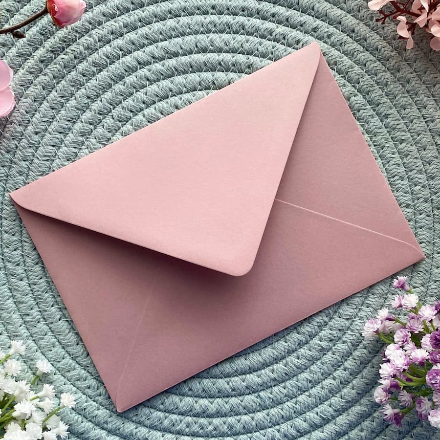 Plic roz pudrat B6 (12.5×17.5cm) din carton de 120 gr/mp ideal pentru invitații de nuntă sau botez elegante sau papetărie premium.