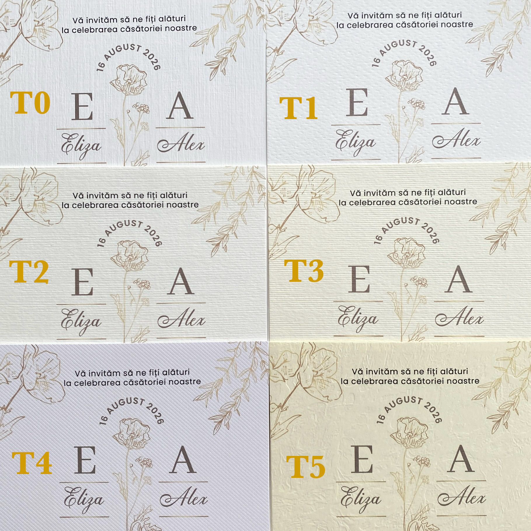 Cartoanele texturate T1, T2 și T3 au textura pe ambele părți (față-verso). Cartoanele texturate T4 și T5 au textura pe o singură parte (față texturat, verso mat) – pentru tipărire față-verso, pagina cu numele mirilor sau cea cu mai mult text se tipărește pe partea texturată.