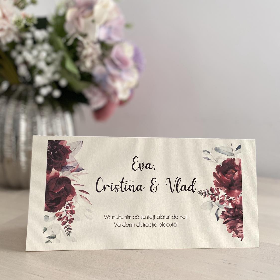 Au ajuns invitatiile si place card-urile. Sunt superbe!!! Se vad foarte frumos si plicurile asa crem cu sigiliul roz. Cu siguranta voi reveni si pentru meniuri la dvs. Va multumesc!